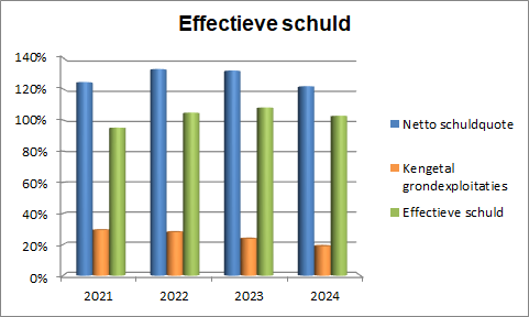 De effectieve schuld is een niet verplicht kengetal dat wij hebben toegevoegd om extra inzicht te verschaffen in de schuldpositie van de gemeente die daadwerkelijk op de exploitatie drukt. Een deel van de schulden waaruit de netto schuldquote is opgebouwd, is namelijk aangegaan om (toekomstige) bouwgronden aan te kopen. Zodra deze bouwgronden verkocht worden, kunnen de betreffende schulden weer afgelost worden. De lasten van deze schulden worden gecompenseerd door de grondexploitaties. Daarom is het belangrijk ook een beeld te hebben van de netto schuldquote gecorrigeerd voor het kengetal grondexploitatie.